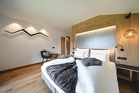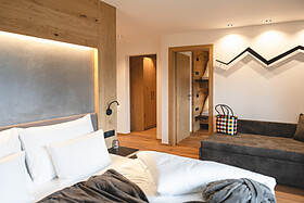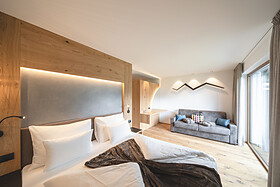 ...con balcone, soggiorno e camera da letto separati, pavimento in legno, divano letto, tavolo d’angolo, frigorifero, bollitore con selezione di tè, fontanella dell’acqua di sorgente, 2 TV, WiFi, telefono, cassaforte, bagno con doccia, WC, bidet, phon, specchio per truccarsi, borsa wellness con asciugamano e accappatoio.
